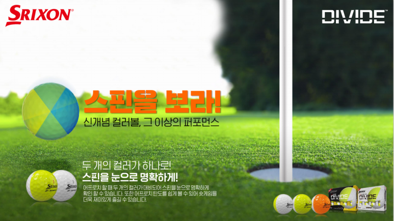 단색의 골프공은 회전을 눈으로 확인하기 어려운점이 있는데 두가지색깔로 나누어진 스릭슨 디바이드 골프공은 공의 회전하는 모습을 눈으로 볼 수 있다는 장점이 있다. 특히 퍼트할때 공이 일정한 속도로 굴러가는지도 자세히 확인이 가능하다.