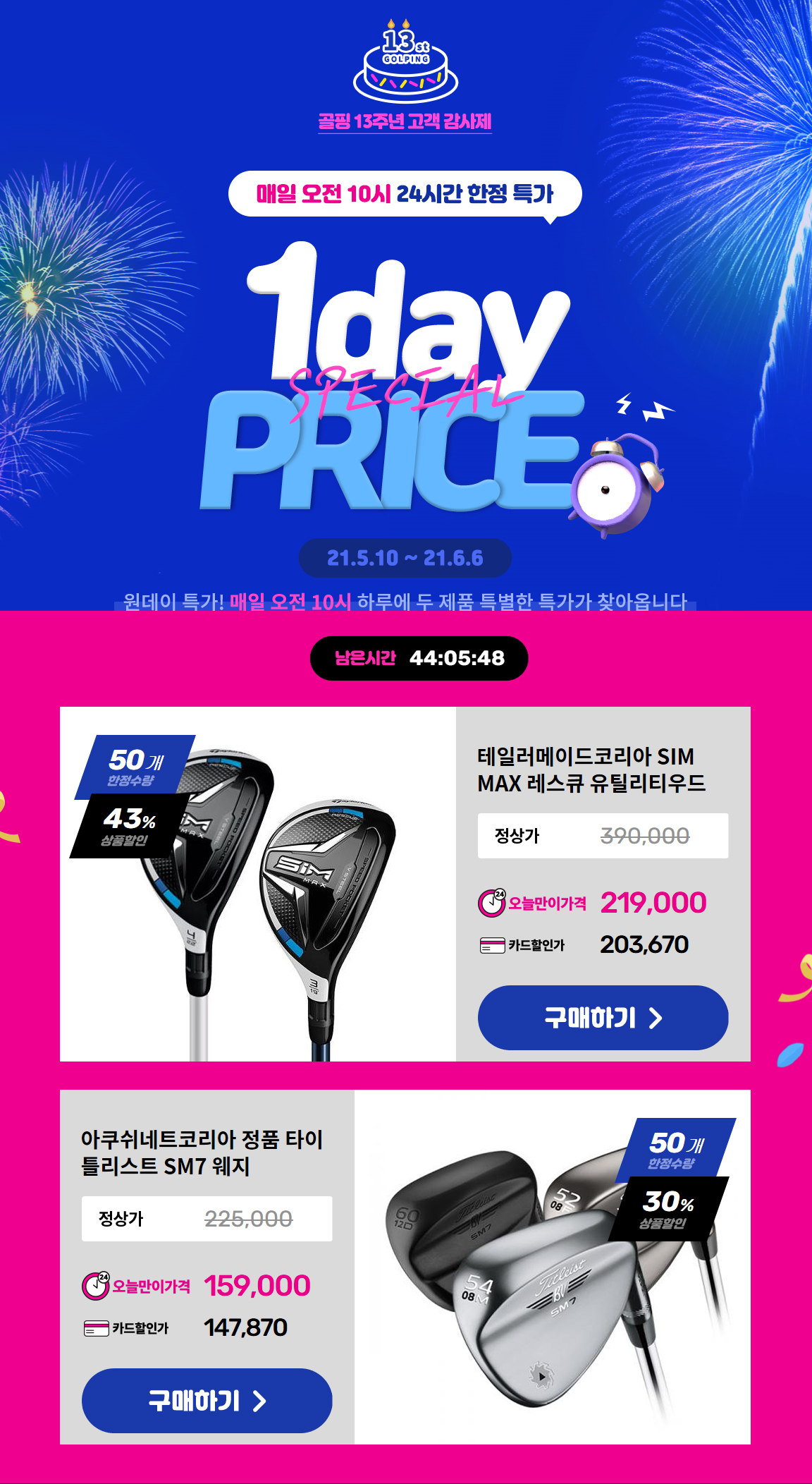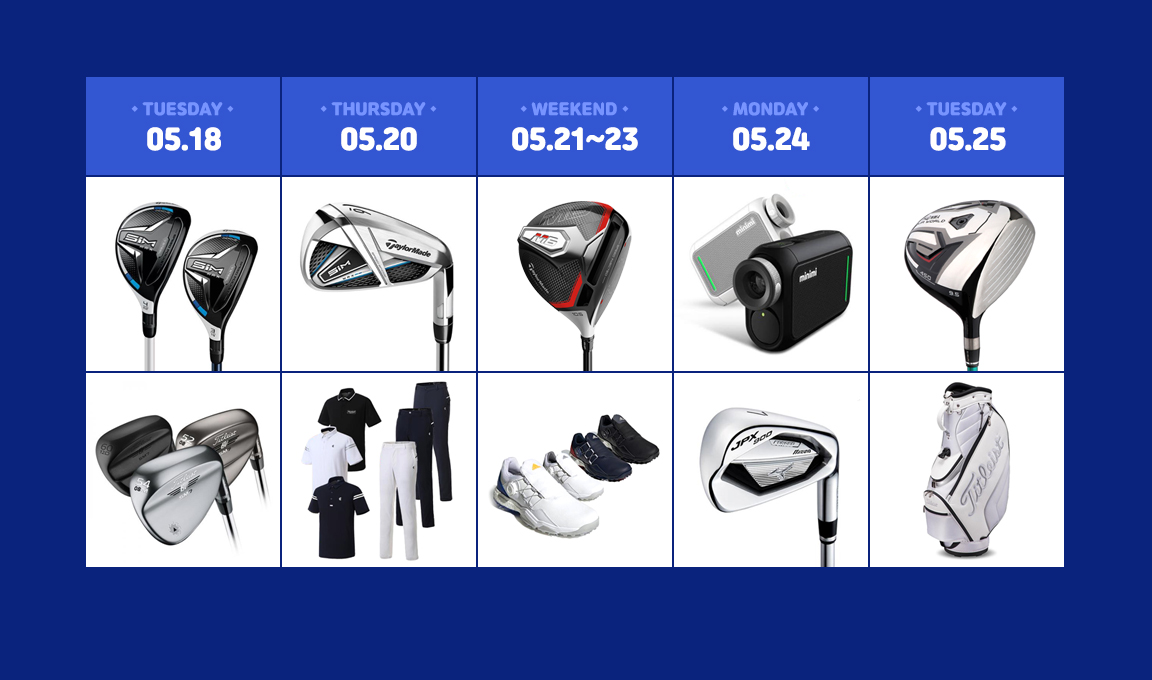 24시간 한정1 DAY 특가 이벤트는 매일 오전 10시 하루에 두 제품이 특가로 올라온다. 5.18일 오늘은 테일러메이드 SIM MAX 레스큐 유틸리티 우드, 아쿠쉬네트 코리아 정품 타이틀리스트 SM7 웨지가 올라와 있다. 특가 제품은 6월 6일까지 매일매일 바뀔 예정이므로 갖고 싶었던 제품이 있으면 주의 깊게 살펴보다가 저렴하게 구매할 수 있는 좋은 기회가 될 수 있다.