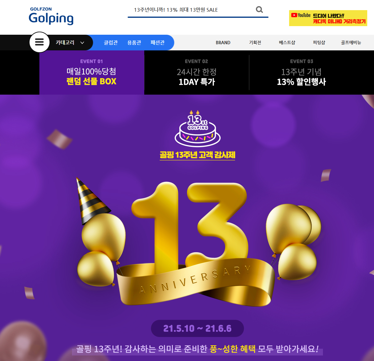 골프존마켓 골핑에서 13주년을 맞이해 고객 감사제 이벤트를 마련했다. 기간은 5월 10일부터 6월 6일까지이며 매일매일 선물상자에 응모할 수 있다. 랜덤 선물 BOX 이벤트 외에도 24시간 한정 1 DAY 특가 이벤트 및 13주년 기념 13% 할인행사 이벤트도 진행 중이다. 13% 할인 쿠폰 선착순 증정은 20만 원 이상 구매 시 적용 가능하다.
