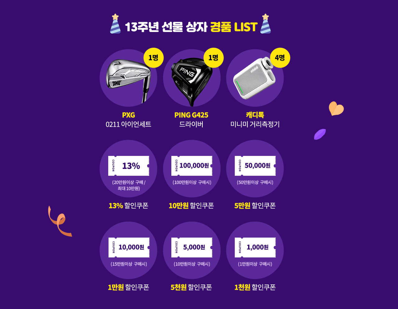 13주년 기념 이벤트라 그런지 경품도 스케일이 꽤 크고 푸짐하다. 경품은 PXG아이언세트 1명, PING G425드라이버 1명, 캐디 톡 미니미 거리측정기 4명, 13% 할인쿠폰, 10만 원 할인쿠폰, 5만 원 할인쿠폰, 1만 원 할인쿠폰, 5천 원 할인쿠폰, 1천 원 할인쿠폰 등이다.