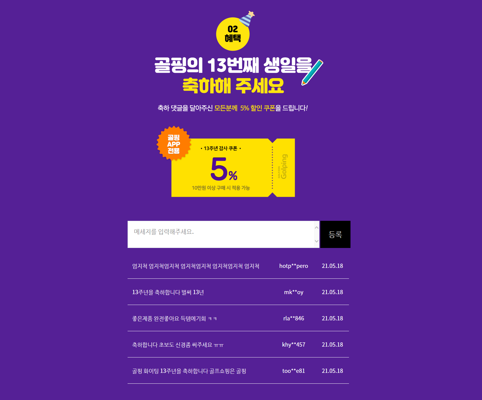 골핑 13번째 생일 이벤트 댓글창에 댓글을 달면 댓글 단 모두에게 5% 할인 쿠폰을 제공한다. 평소 사고 싶었던 용품이나 장비가 있다면 이 기회에 마련해 두는 것도 좋은 방법이다.