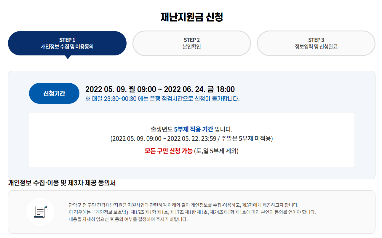 관악구민 재난지원금 온라인 신청방법은 굉장히 간단한데요, 방법은 아래와 같습니다. 5.22일까지 5부제로 운영되는 점 참고하시기 바랍니다.(주말은 5부제 상관없이 모든사람이 신청 가능)