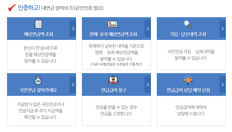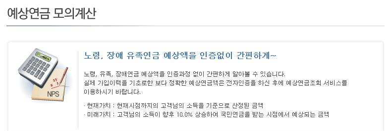 국민연금공단(NPS) 홈페이지에 접속 → 공동 인증서 로그인 후 전자민원 → 개인 민원 → 조회 → 예상연금액 조회 →국민연금 예상연금액 알아보기