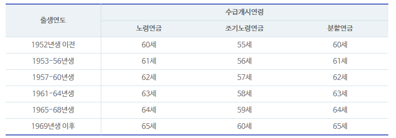53 ~ 56년생의 경우 61세, 57 ~ 60년생의 경우 62세, 61 ~ 64년생의 경우 63세, 65 ~ 68년생의 경우 64세, 69년생 이후부터는 65세부터 수급을 받을 수 있다.