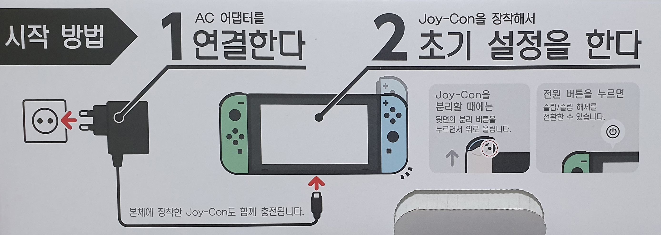 본체 충전방법과 조이콘 결합 해제 방법은 위와 같다. AC 어댑터에 본체를 연결하면 충전이 되는데 양쪽에 조이콘을 끼워두면 조이콘도 함께 충전이 된다. 조이콘을 본체에 끼울 때에는 홈이 파져 있는 모양대로 바로 내려 끼우면 되고 분리할 때에는 뒷면의 까만색 동그라미 분리 버튼을 누른 채로 위로 올리면 분리된다.