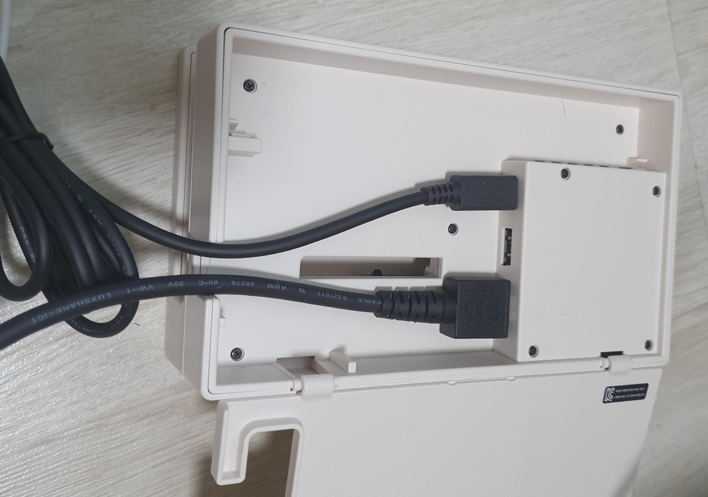 AC 어댑터와 HDMI 케이블을 스위치 독에 연결하고 본체를 독에 그림과 같이 꽂는다. 그다음 TV 외부 입력에 들어가서 실행시키면 된다.