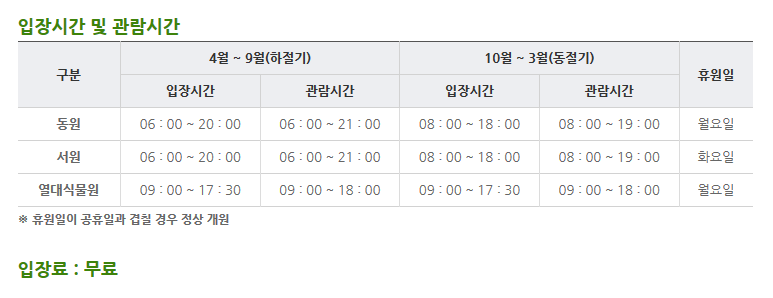 대전 서구에 위치한 한밭수목원은 주말 가족 나들이 장소로 찾기에 매우 좋은 장소로, 무료로 관람할 수 있는 식물원과 곤충 생태관, 인근에 자리한 천연기념물센터와 장미원 등 다양한 볼거리와 체험할 것들을 제공한다. 동절기와 하절기 운영 시간이 다르므로 미리 확인하고 방문하는 것을 추천한다. 매주 월요일은 휴원일이다. 입장료는 무료이고 주차는 3시간까지 무료로 이후부터는 매 15분 일반차량 기준으로 600원씩 금액이 추가된다.