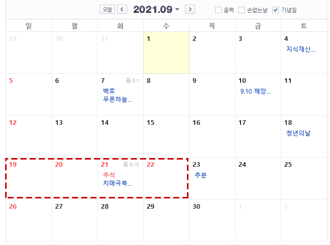 - 9월 20,21,22 추석(월, 화, 수요일)
