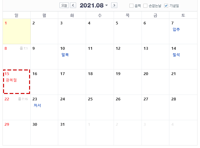 8월 - 광복절(대체휴무 적용 시 8월 16일(월))