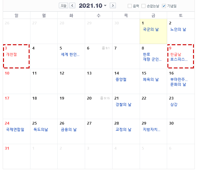 - 10월 3일 개천절(일요일), 9일 한글날(토요일)