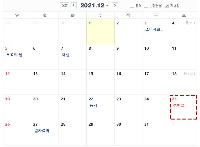 12월 - 크리스마스(대체휴무 적용 시 12월 27일(월))