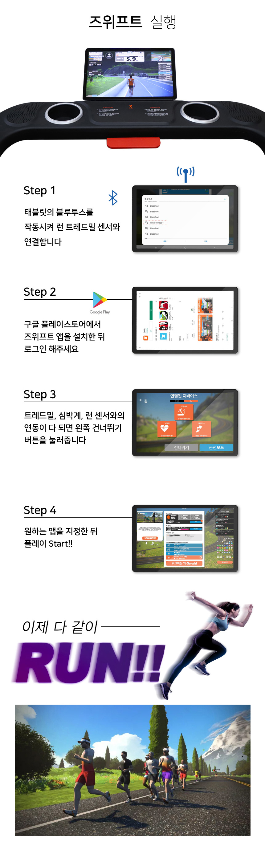 즈위프트 자전거 뿐만아니라 러닝머신으로도 전 세계 러너들과 가상 러닝이 가능하다는 사실!! 요즘 같은 언택트 시대에 전 세계 러너들과 한데 어울려 달릴 수 있다니 정말 멋진 일인 것 같다. 그동안 티비만 보면서, 음악만 들으면서 러닝머신을 사용했던 분들이라면 즈위프트 런 센서는 좀 더 역동적이고 신선한 재미로 다가올 수 있다.