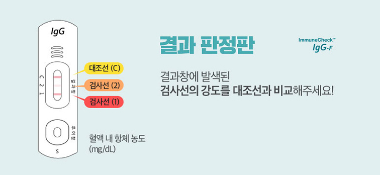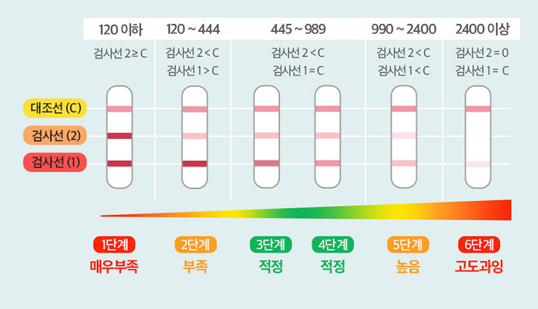 결과 판정판에는 검사선에 따라 면역력 상태(매우 부족, 부족, 적정, 높음, 고도 과잉)를 알 수 있도록 안내 이미지가 있다.