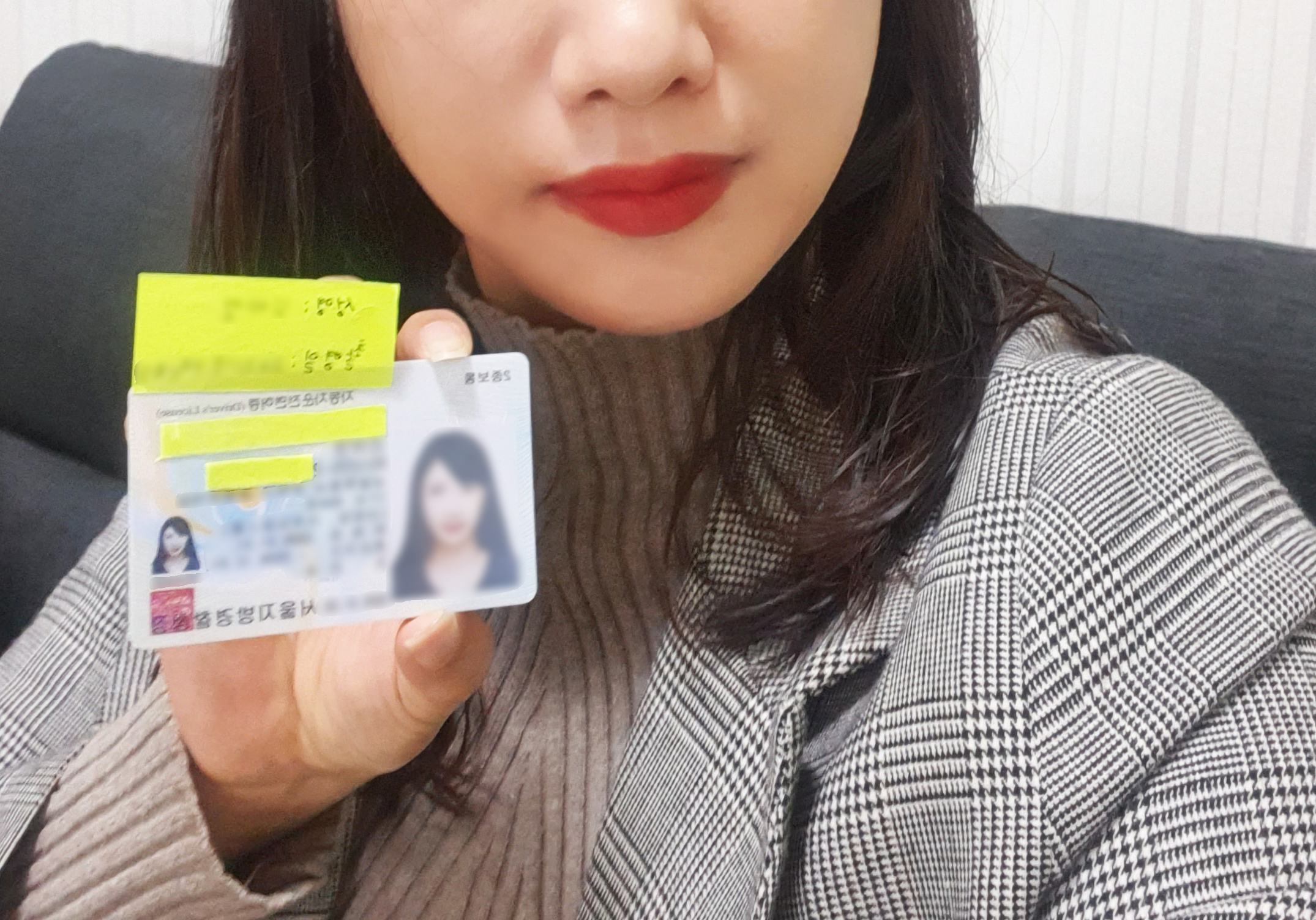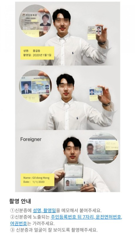 포스트잇을 잘라서 운전면허 번호와 주민등록번호 뒷자리를 가려주고, 그 위에 성명과 촬영일을 적은 포스트잇을 스카치테이프로 붙여주었다. 그 결과 바로 통과가 되었고 문자 한 통이 날아왔다.