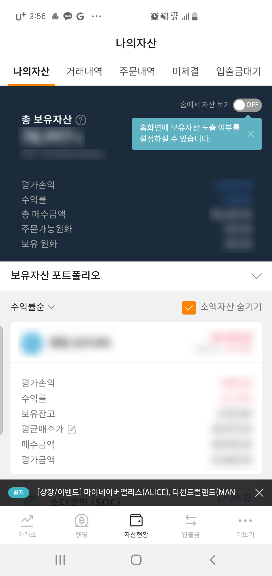 잘 체결되었는지 확인하기 위해 자산 현황에 들어가면 보유 자산 포트폴리오가 뜬다. 비트코인 역시 주식처럼 리스크가 항상 도사리고 있으므로 과하지 않게 소신껏 잘 운용해야 한다.