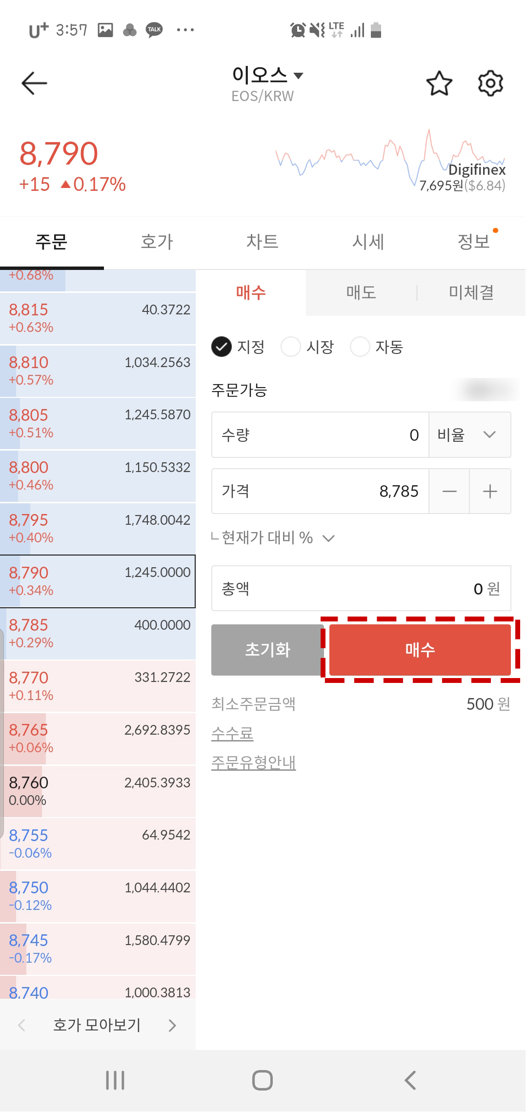 원하는 수량을 입력하고 매수 버튼을 누르면 주문이 체결된다. 이때 현 시세에 맞게 빠르게 구매하고 싶다면 시장가를 이용한다. 비트코인은 주식과 다르게 변동성 리스크에 대한 감내를 24시간 동안 늘 해야 하는 투자수단으로 마음 편하게 비트코인 적립식 투자를 추천한다.