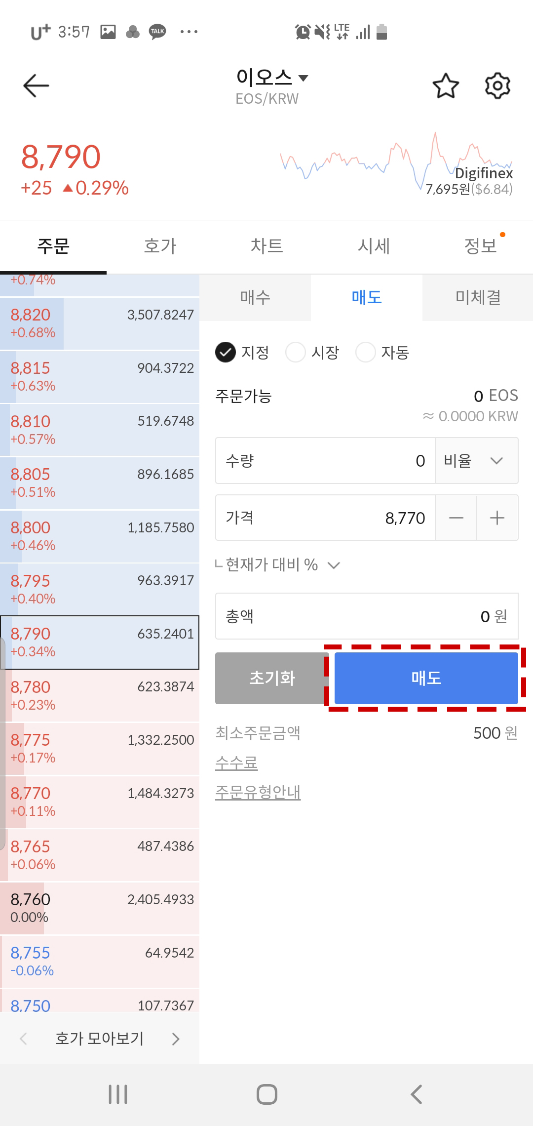 매도 역시 매수와 마찬가지로 원하는 수량을 입력하고 매도 버튼을 누르면 된다.