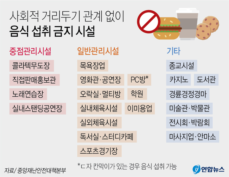 국내 코로나19 신규 확진자는 482명으로 이틀째 500명 안팎을 유지하는 가운데 확진자 감소세가 보이지 않자 정부는 수도권 2단계, 비수도권 1.5단계 등 현행 사회적 거리두기와 5인 이상 사적 모임 금지 조치를 내달 11일까지 2주 더 연장키로 했다. 여기에 음식물 섭취가 불가능하도록 경기장·도서관 등 총 21개 업종에서 음식을 먹지 못하게 하는 기본방역수칙을 적용한다.