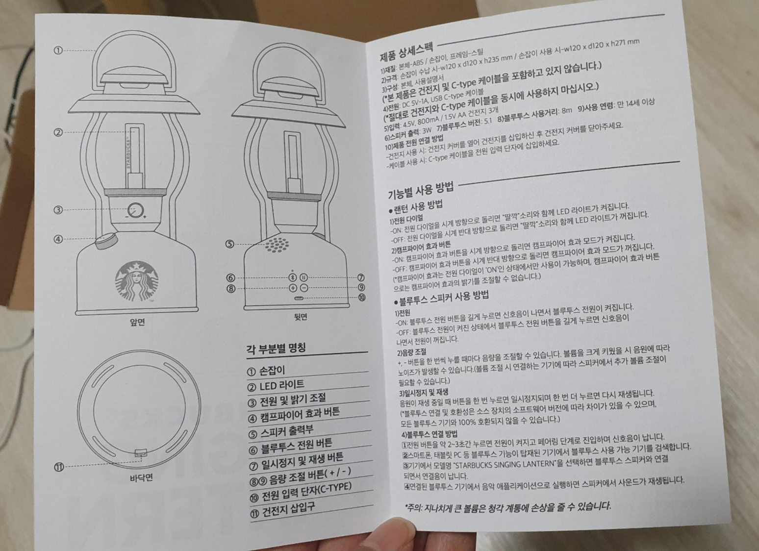 사용설명서에는 각 부분멸 명칭 및 사용 방법, 제품 상세 스펙, 주의사항 등이 기재되어있다. 핸드폰을 충전하던 케이블을 랜턴 본체에 꽂아보니 연결이 되었다. 블루투스 버튼을 누르고 핸드폰과 연결해서 노래를 틀어보니 음질은 생각했던 것보다 좋지 않았다. 블루투스 전문 기기가 아니라서 그런지 듣는 내내 지직 거림이 꽤 심했다. 아쉽게도 음악은 휴대폰이나 다른 스피커로 듣는 것을 추천한다. 블루투스 용도로 선택했다면 다소 후회가 있을 수 있다.