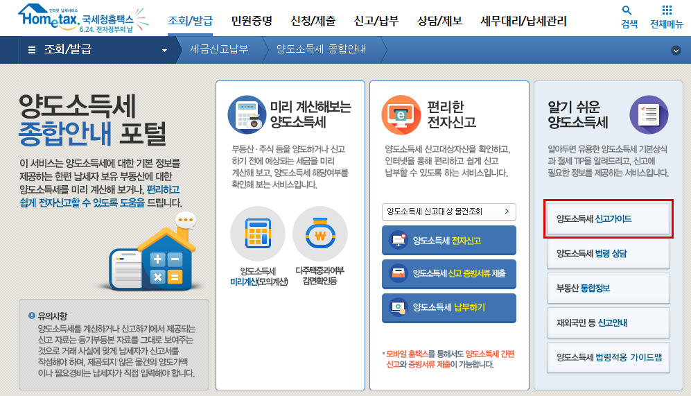 1. 조회/발급에서 세금신고납부, 양도소득세 종합안내에 들어간다.