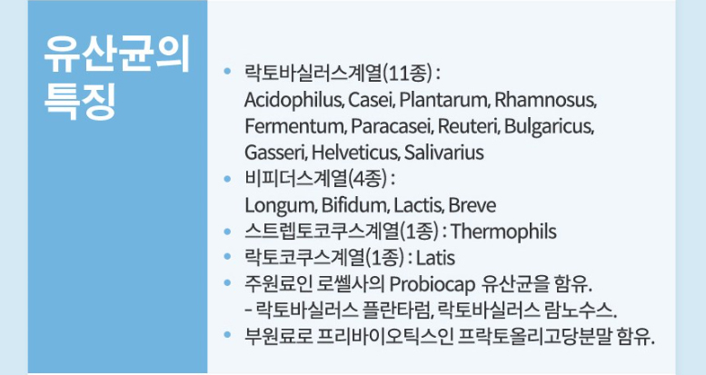 홍삼 가득 유산균에는 홍삼 추출분말이 아닌 홍삼을 그대로 분쇄해 넣어서 홍삼의 모든 성분을 그대로 섭취할 수 있도록 만들어진 것이 장점으로 면역력 증진, 피로개선 등에 도움을 주며 이에 더해 17종의 유산균(락토바실러스 플란타럼, 락토바실러스 람노수스 등 로쎌사의 PROBIOCAp유산균을 함유하여 장 건강에 도움을 준다고 한다.
