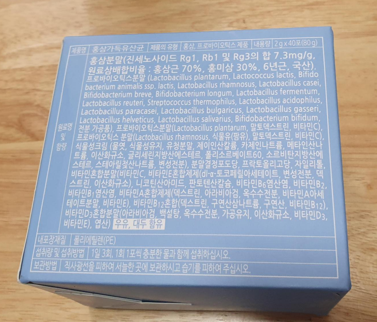 검색창에 프로바이오틱스를 치면 엄청나게 많은 제품들이 쏟아진다. 내 개인적인 취향으로는 알약보다는 가루가 맛도 좋고 간식 챙겨 먹는 기분이 들어서 요구르트맛이 나는 가루를 선호하는 편이다. 얼마 전까지 일반 프로바이오틱스 유산균만 먹던 나는 새로운 장 유산균을 찾던 중 홍삼이 들어간 유산균을 발견했다. 아무래도 일반 프로바이오틱스보다 더 좋은 시너지 효과가 있을 것 같아 이왕이면 다홍치마라며 홍삼 가득 유산균을 주문하게 되었다.