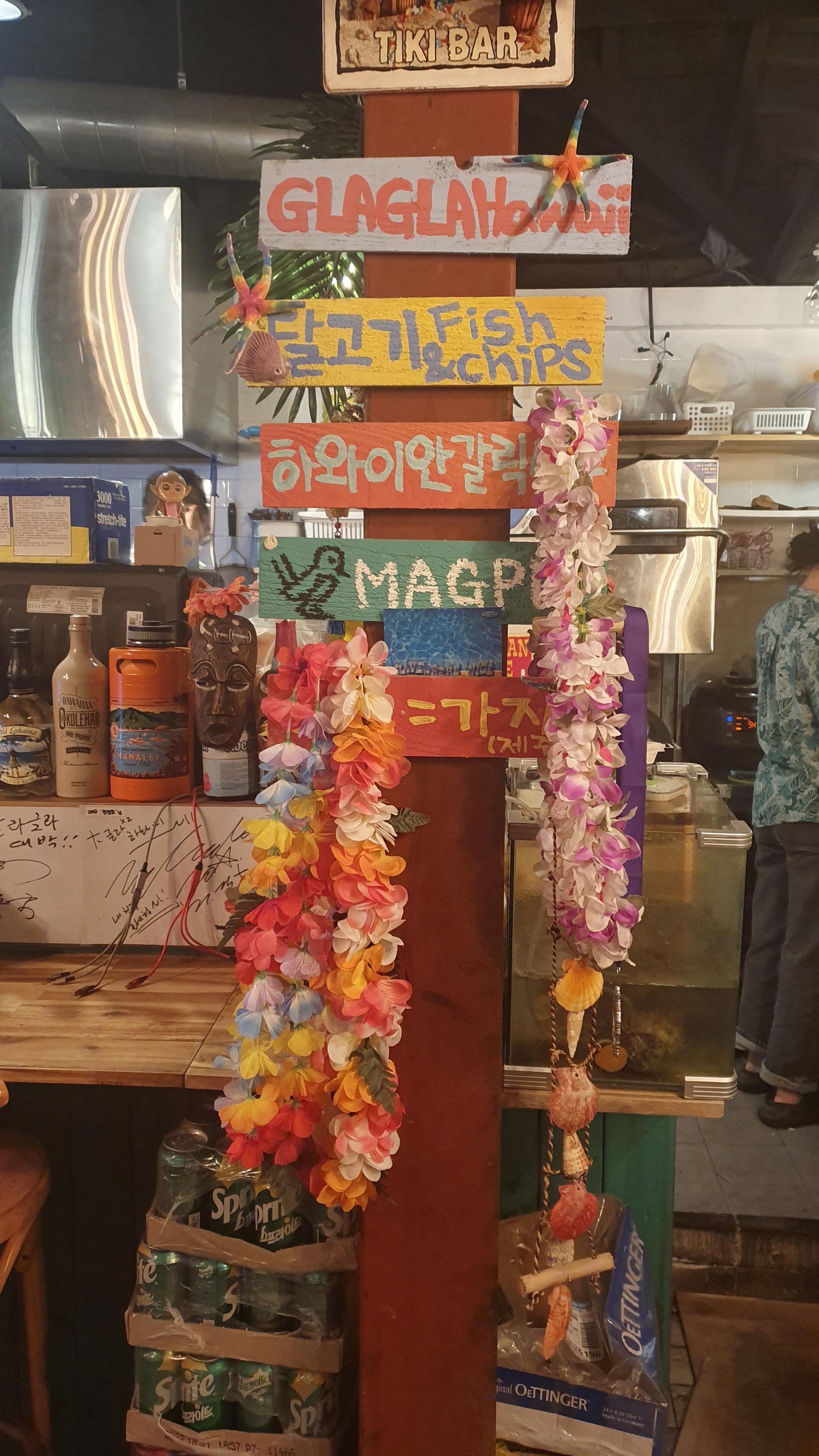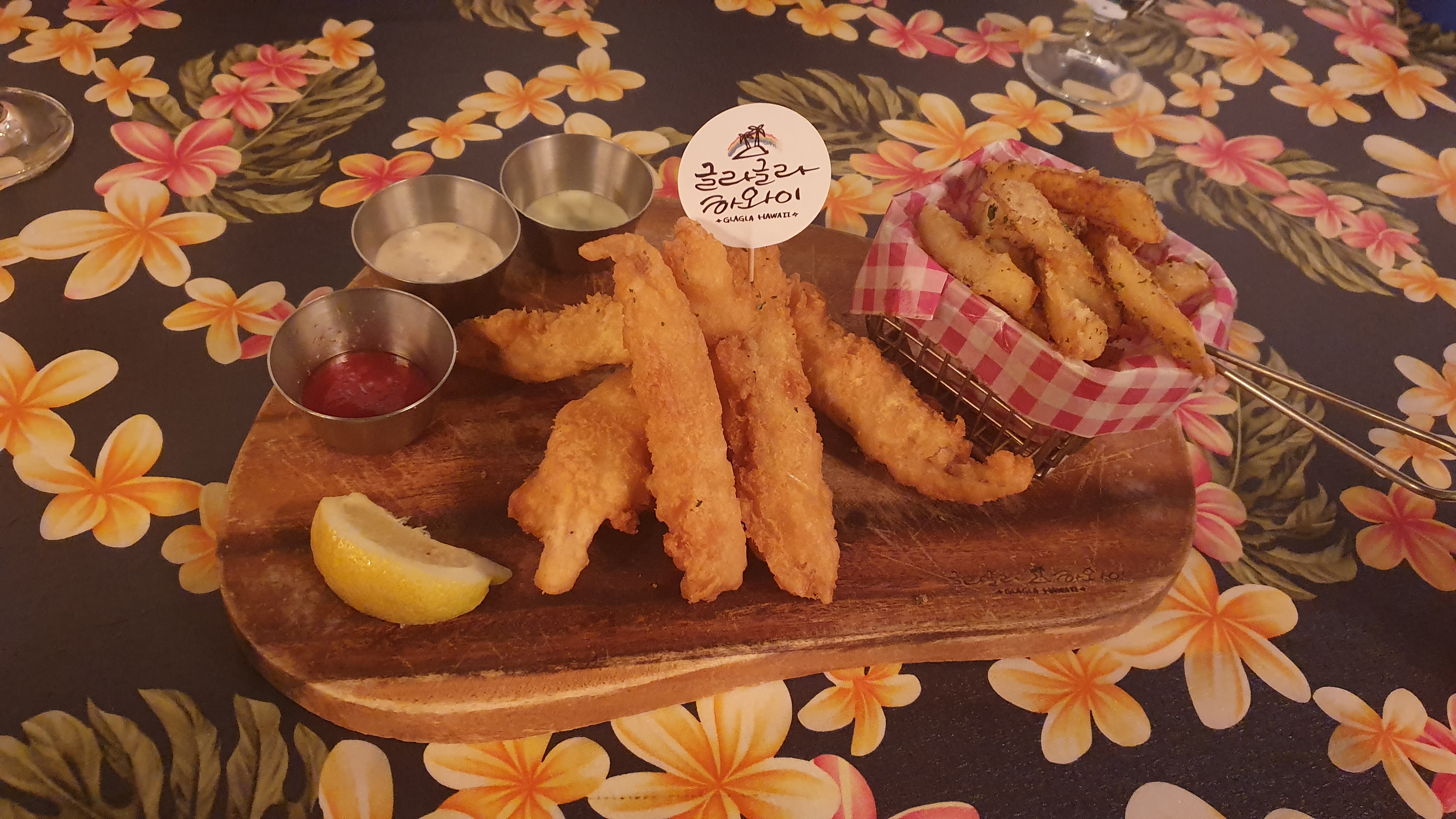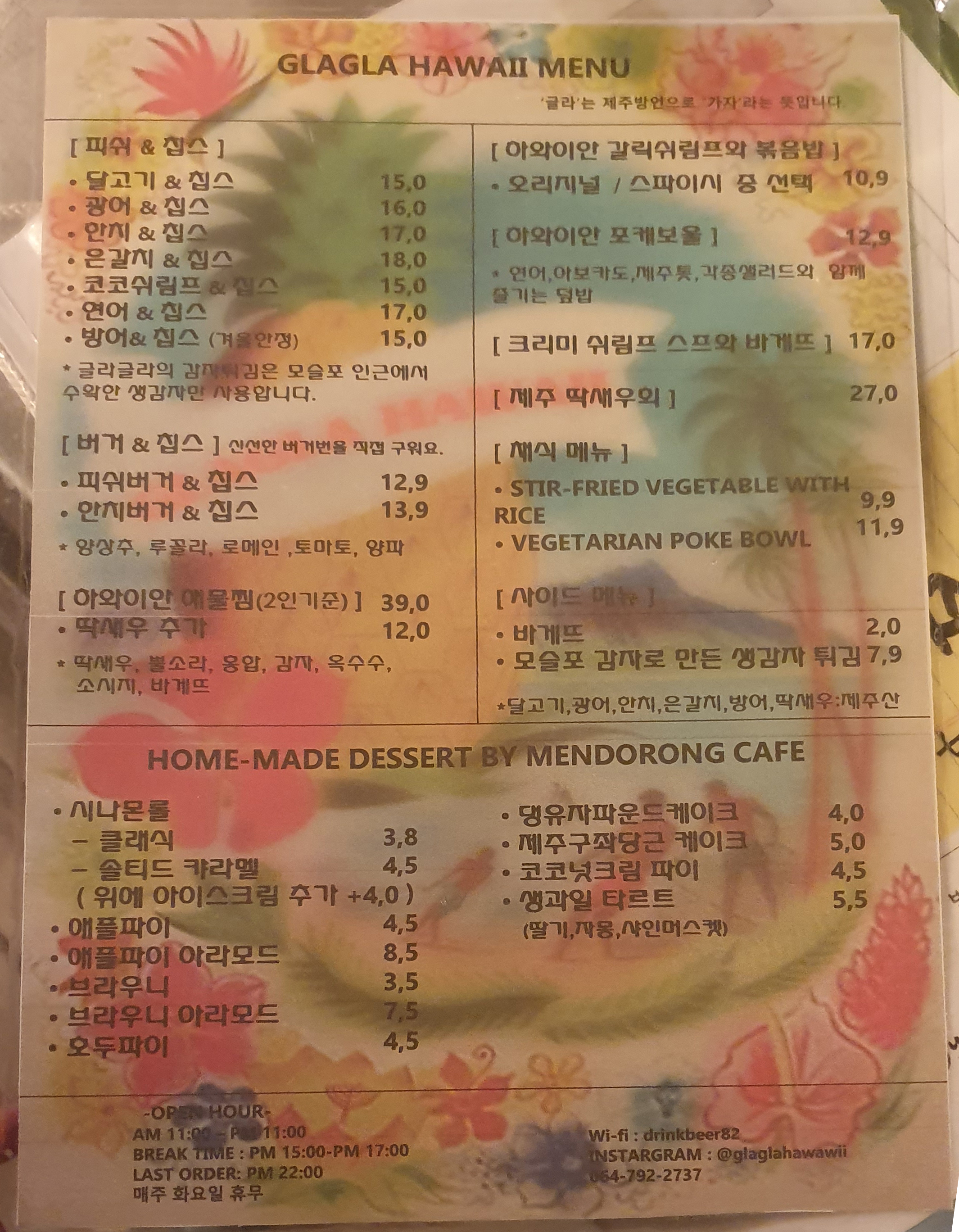 제주 속의 작은 하와이안 레스토랑 느낌으로 하와이스러운 내부 인테리어가 특징인 곳. 피시 앤 칩스가 유명하다. 이날 원래는 광어 앤 칩스로 주문을 했는데 광어가 없고 대신 민어로 조리를 해주셨는데 너무 식감이 부드럽고 입안에서 살살 녹아서 인상적이었다. 칵테일이 하와이 느낌의 화려한 꽃무늬 테이블 천과 잘 어울린다.