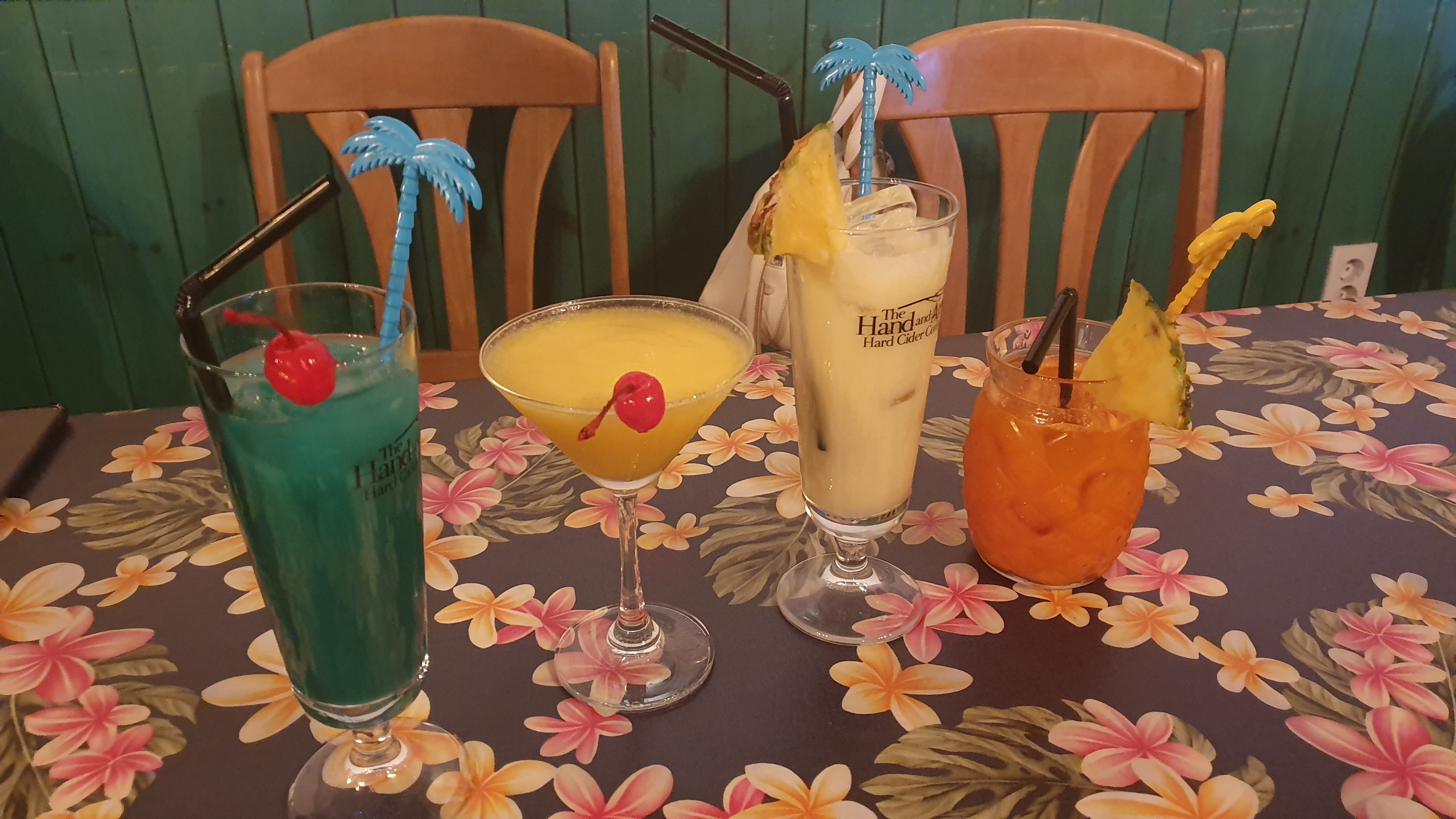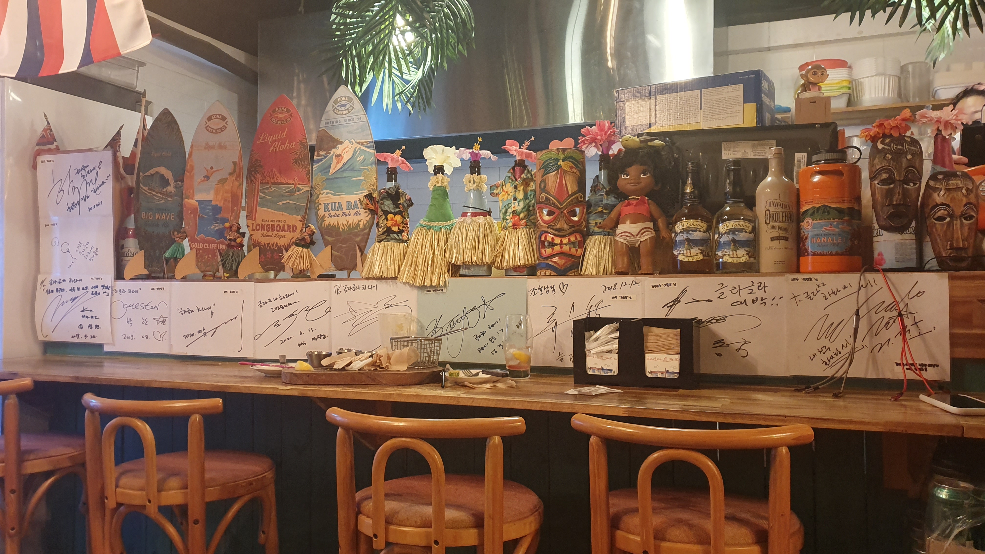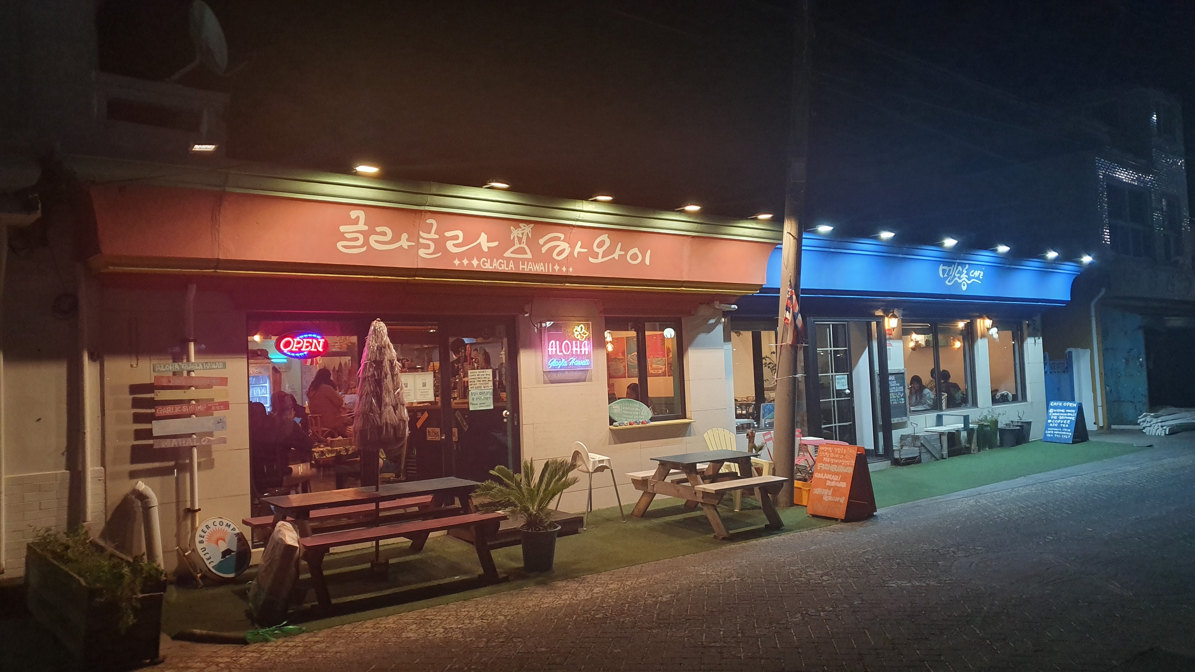 제주 속의 작은 하와이안 레스토랑 느낌으로 하와이스러운 내부 인테리어가 특징인 곳. 피시 앤 칩스가 유명하다. 이날 원래는 광어 앤 칩스로 주문을 했는데 광어가 없고 대신 민어로 조리를 해주셨는데 너무 식감이 부드럽고 입안에서 살살 녹아서 인상적이었다. 칵테일이 하와이 느낌의 화려한 꽃무늬 테이블 천과 잘 어울린다.