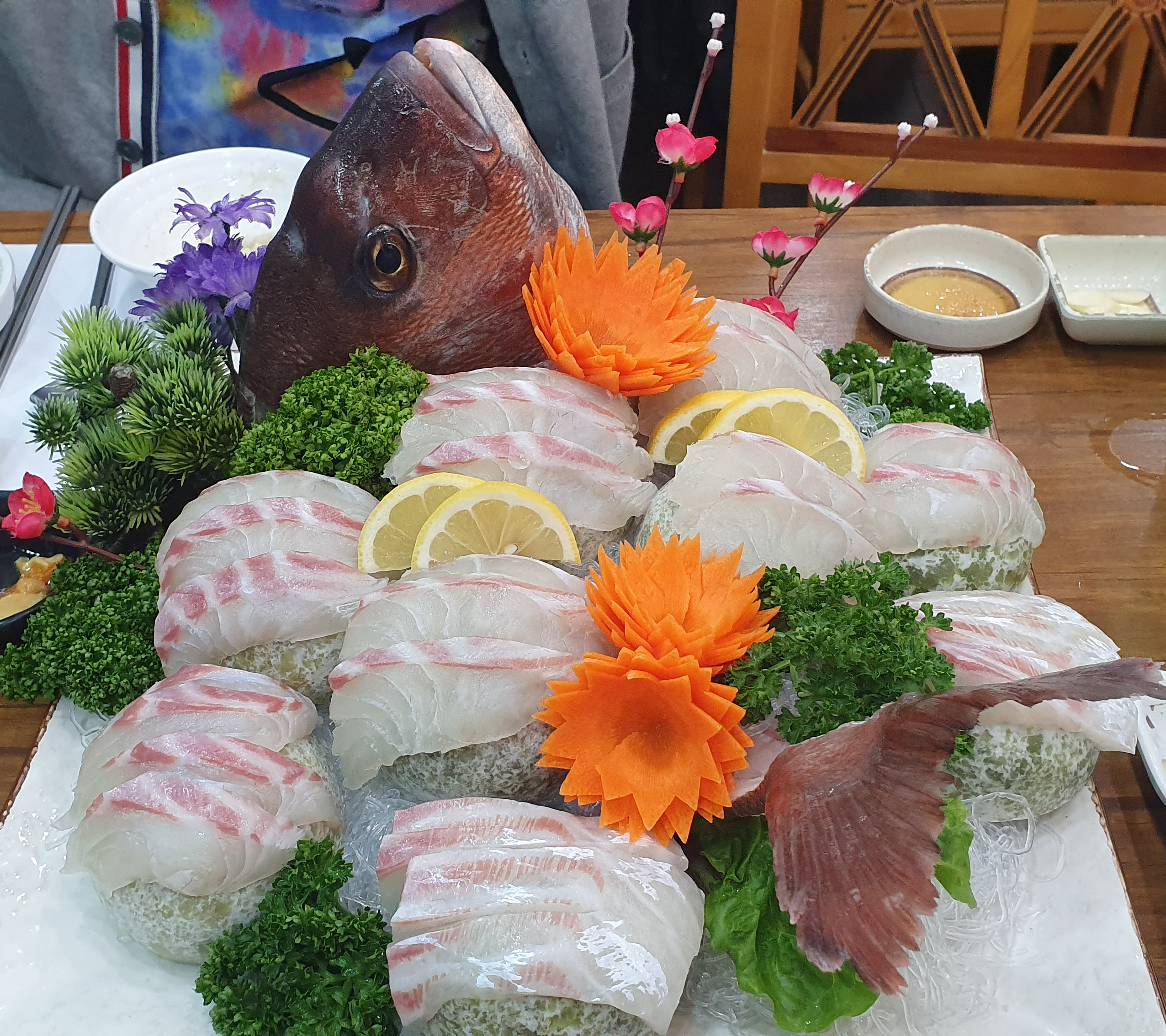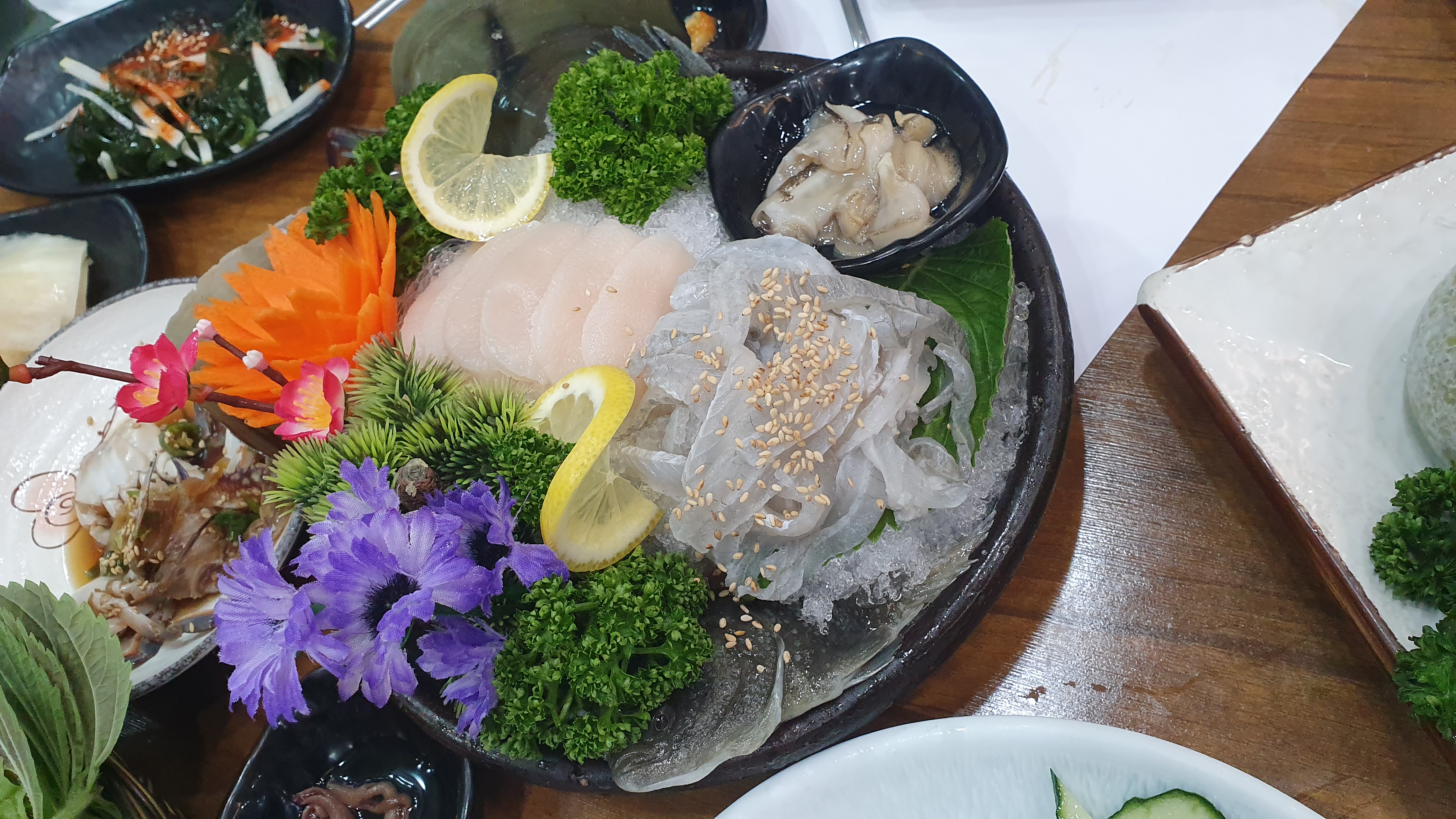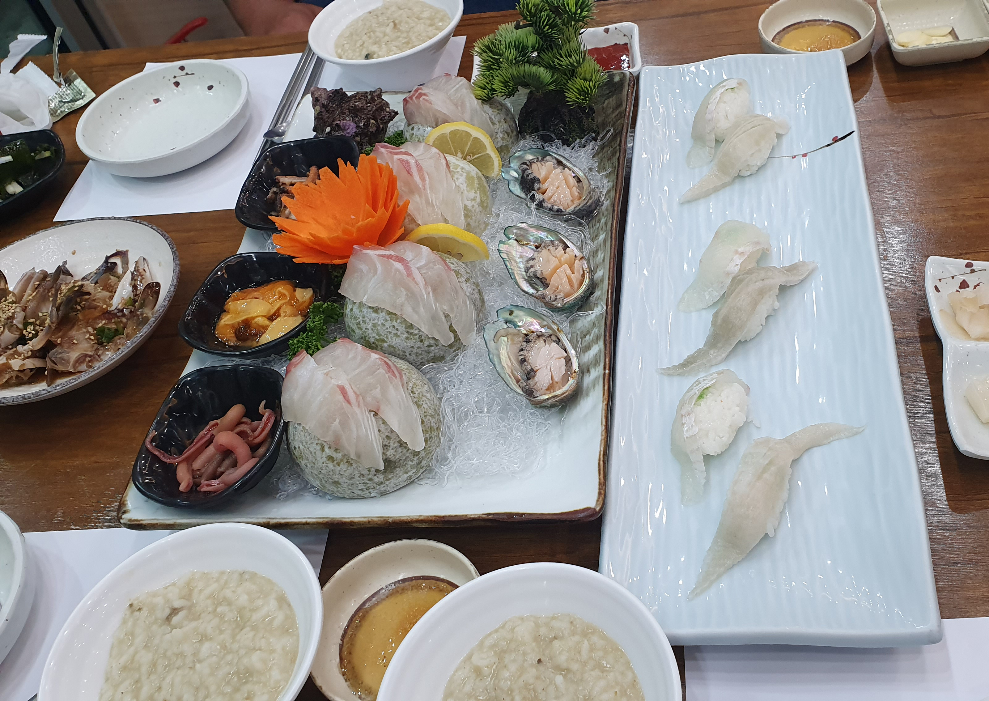 바닷가 앞에 위치해서 전망을 즐기면서 회를 먹을 수 있는 것이 장점. 가게가 큰 편이라 5인 이상 모임 금지가 풀린다면 추후에 단체로 가기에도 좋다. 화려한 플레이팅뿐만 아니라 최상의 싱싱함으로 입안에 회를 넣자마자 감탄사가 절로 나오는 맛이다. '자연산은 이런 맛이구나!'라는 느낌. 적당히 두툼한 두께감으로 식감도 좋고 씹을수록 단맛이 느껴진다.