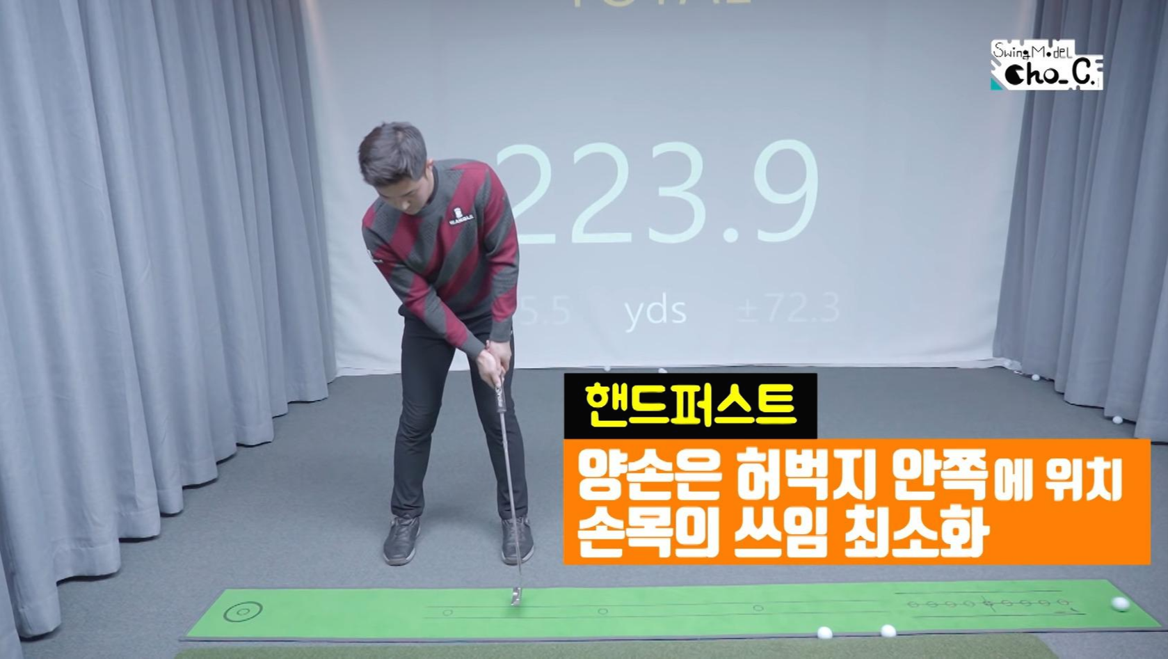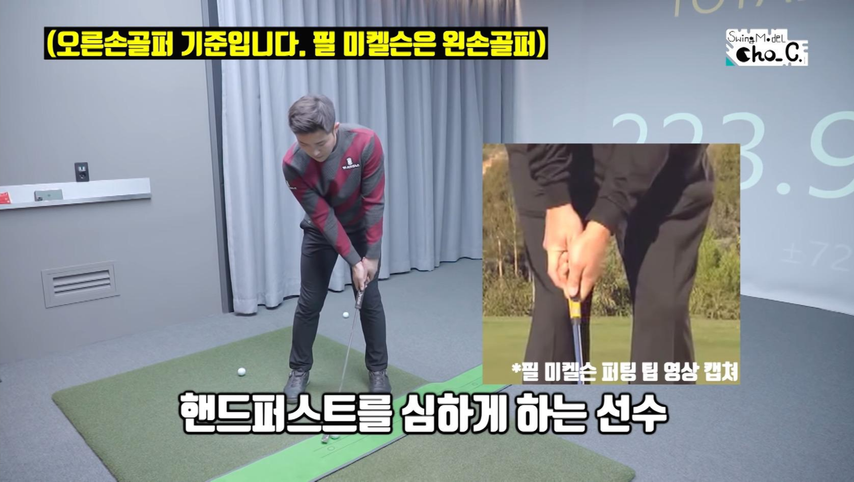 핸드퍼스트는 흔히 아이언을 칠 때 많이 생각하는데 퍼터에도 핸드퍼스트 동작이 도움이 된다고 한다. 그는 세계적인 선수 필 미켈슨을 소개하며 핸드퍼스트를 고집하는 그가 숏게임에서 단연 1위라며 핸드퍼스트의 중요성을 강조했다. 어드레스를 할 때 양손이 허벅지 안쪽에 위치한 상태로 펏을 하면 된다. 처음엔 어색하게 느껴질 수 있으나 필자도 집에 있는 퍼팅 머신으로 연습해본 결과 방향성이 한결 좋아지는 것을 느낄 수 있었다.