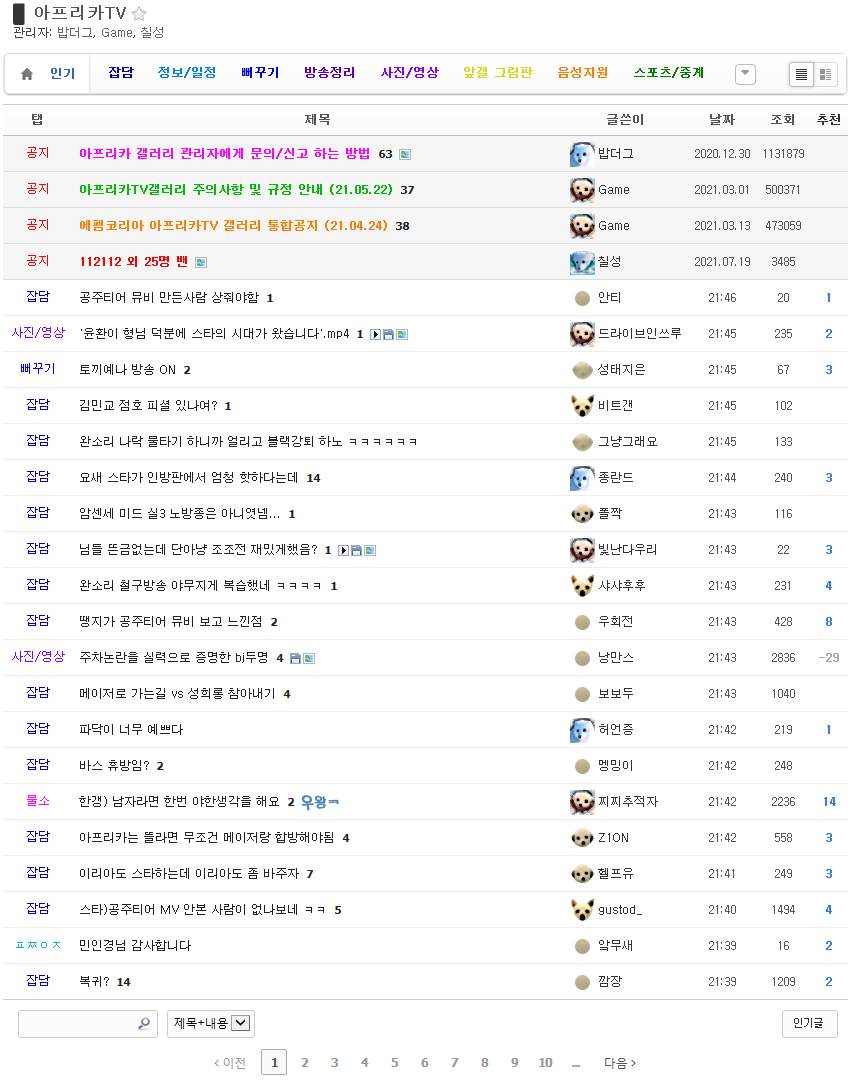 아프리카TV하면 가장 먼저 떠올리는것이 바로 별풍선이다. 아프리카tv는 1인 인터넷 방송의 원조격으로 철구, 감스트, 케이 등 한번쯤 들어본 유명BJ들이 있는 곳이다. 펨코 내 아프리카tv게시판은 2020년 7월 인방갤에서 투표를 통해 아프리카tv 게시판을 원하는 이들의 찬성표로 게시판이 개설되었다고 한다.