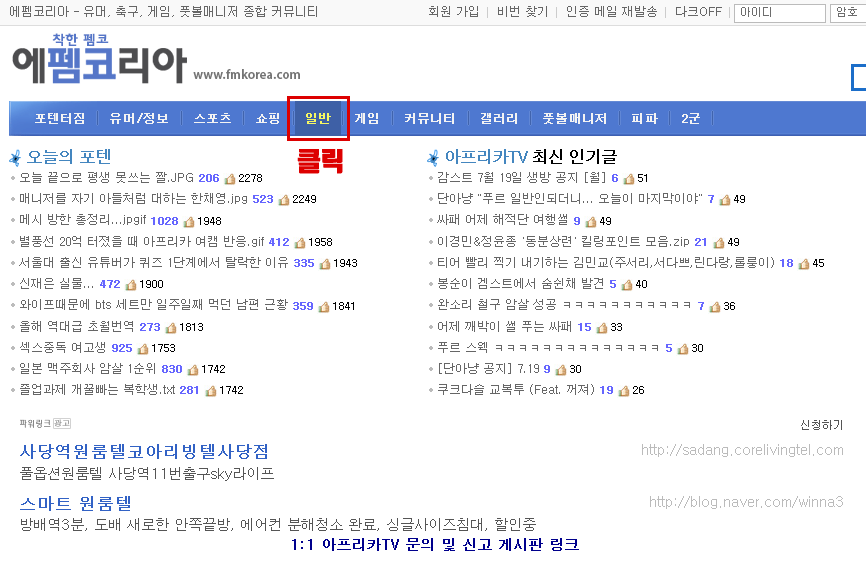 펨코 아프리카의 게시판은 아래와 같은 내용들이 올라와 있다. 에펨코리아에서 또 한 번 주목해야 할 곳은 '포텐 터짐'이라는 게시판으로, 게시글 올라온 것들 중 베스트만 모아둔 곳으로 최근의 핫뉴스, 키워드, 사건 등에 대해 한눈에 알 수 있다.