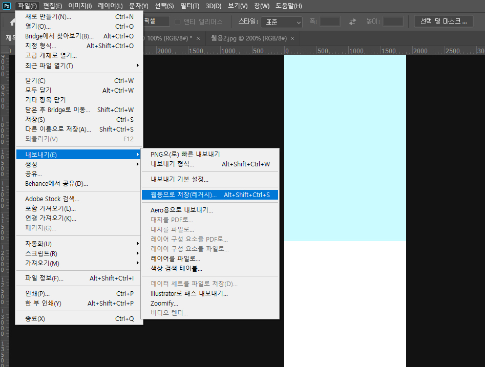Save foe web의 단축키는 Ctrl+Alt+Shift+S이다. 평소처럼 단축키를 이용해 웹용으로 저장하려는데 갑자기 안되면서 머리가 새하얘지는 것을 경험했다. '내가 단축키를 잘 못썼나? 단축키를 잊어버렸나?' 하면서 계속해보지만 여전히 무반응이다. 단축키를 사용하지 않을 경우에는 File → Export → Save for Web(Legacy) , 한글판일 경우 파일 → 내보내기 → 웹용으로 저장 하면 된다.
