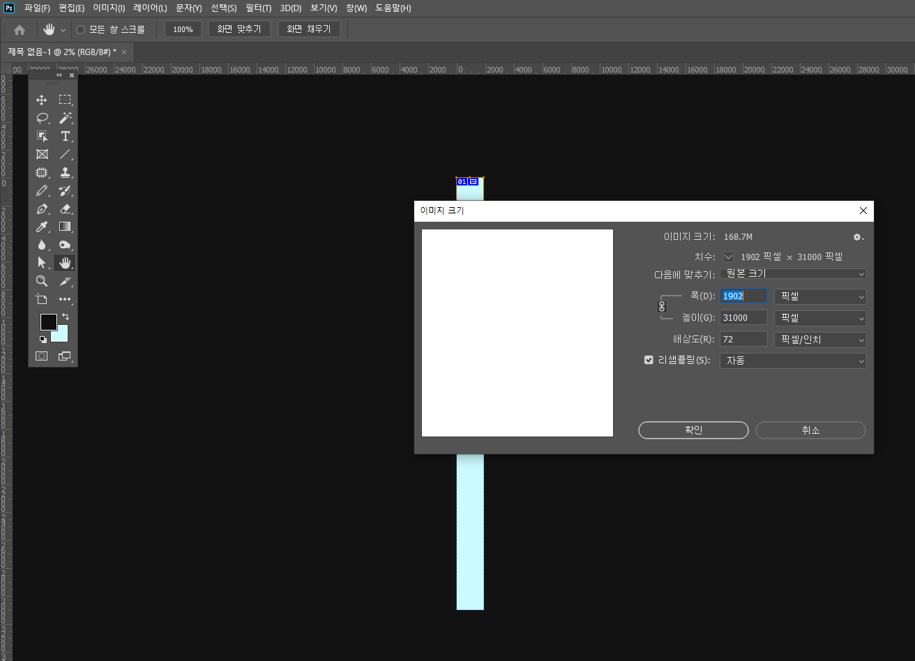 높이가 31000이었던 이미지 사이즈를 줄여 29900을 만들어 주었더니 웹용으로 저장이 가능해졌다. 이미지 사이즈는 Ctrl+Alt+I를 누르면 현재 이미지 사이즈를 확인할 수 있다.
