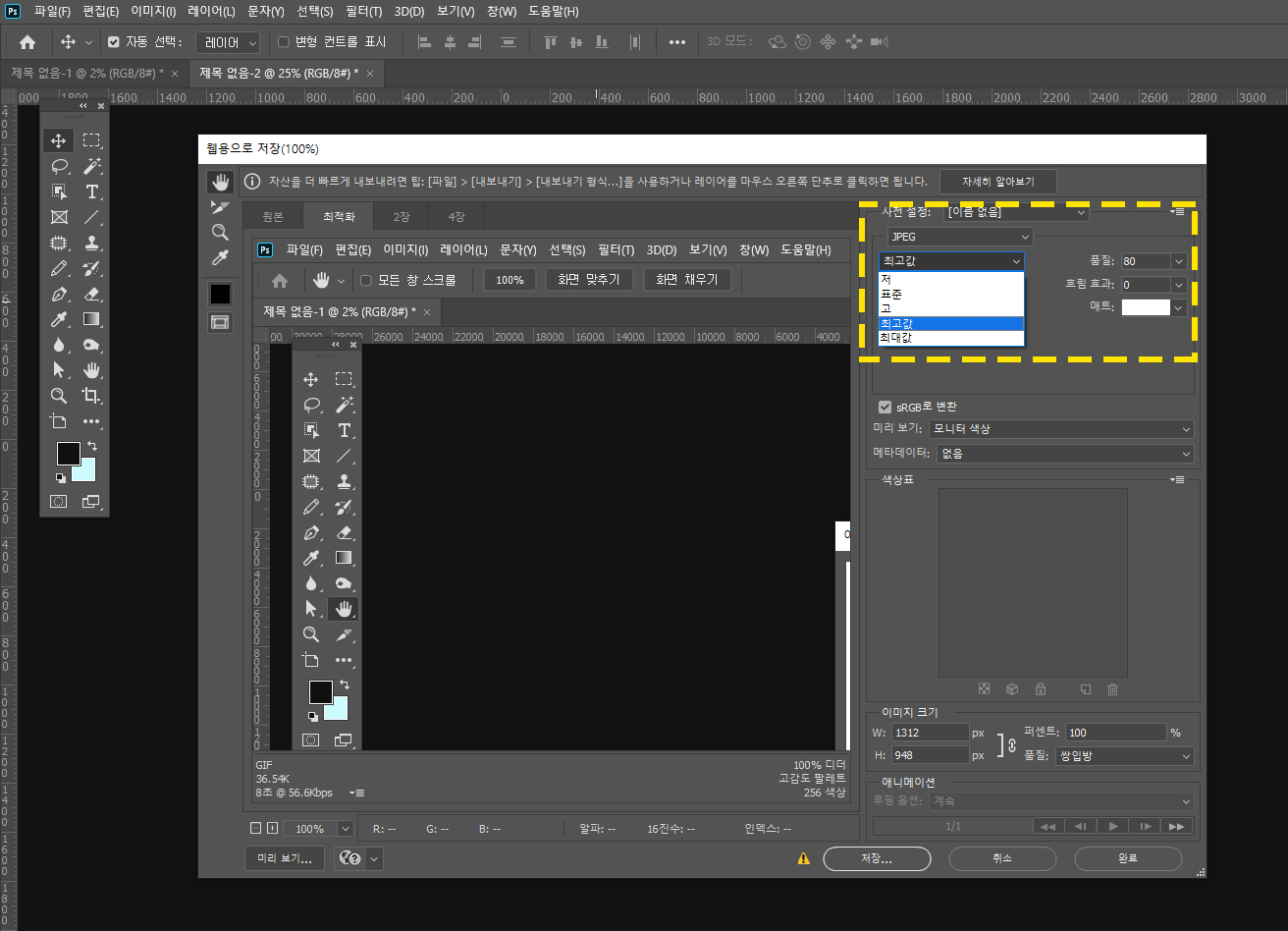 웹용으로 저장 창에서 품질을 조절하여 저장하면 용량이 줄어드는데, 저 값으로 갈수록 화질이 낮아진다. 최댓값은 100%, 최고값 80%, 고 60%, 표준 30%, 저 10% 중 원하는 값을 선택하여 저장하면 된다.