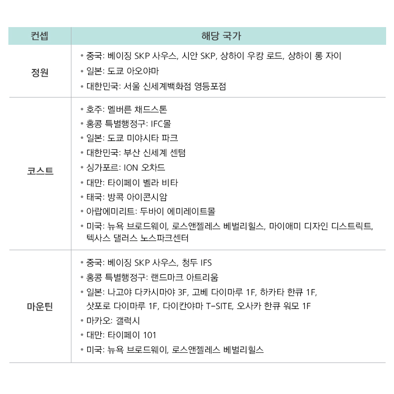 이번 아웃도어 팝업 매장 컨셉은 정원, 코스트, 마운틴 3가지로 나뉘어져 있으며 영등포 타임스퀘어에서 열리는 팝업스토어의 컨셉은 정원 컨셉이다. 아래는 각 나라 컨셉별 팝업스토어를 정리해보았다.