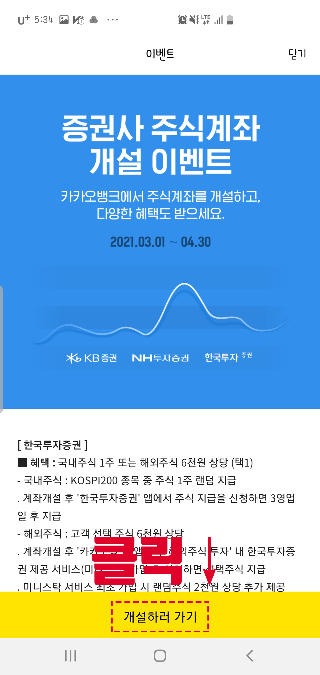 - 여러 증권사의 계좌 개설 이벤트 중 한국투자증권을 선택하고 주식 계좌 개설하러 가기를 클릭한다. 한국투자증권은 4월 30일까지 신규계좌 개설 이벤트가 진행 중이며 계좌 개설 시 수수료 우대 및 KOSPI200 주식 1주를 공짜로 받을 수 있다.