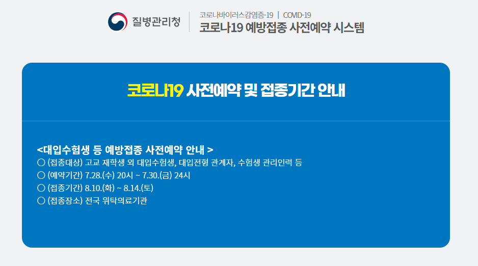8월 9일부터 18일까지는 18~49세 백신 사전예약이 진행되며, 19~21일은 연령대별 추가 예약이 진행될 예정이며 본격적인 예방접종은 8월 26일부터 9월 30일까지 진행됩니다. 8월 9일부터 예방접종 사전예약 시스템(ncvr.kdca.go.kr)에 접속하여 원하는 날짜와 접종 기관을 선택하면 되는데 동네 병원을 선택할 수도 있고, 백신접종센터에서 맞을 수도 있습니다. 매일 오후 8시 예약 접수를 시작하여, 다음 날 오후 6시 마감됩니다.
