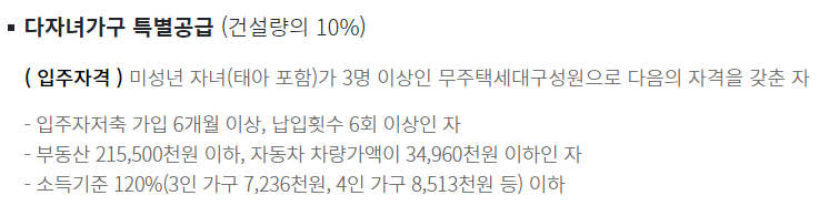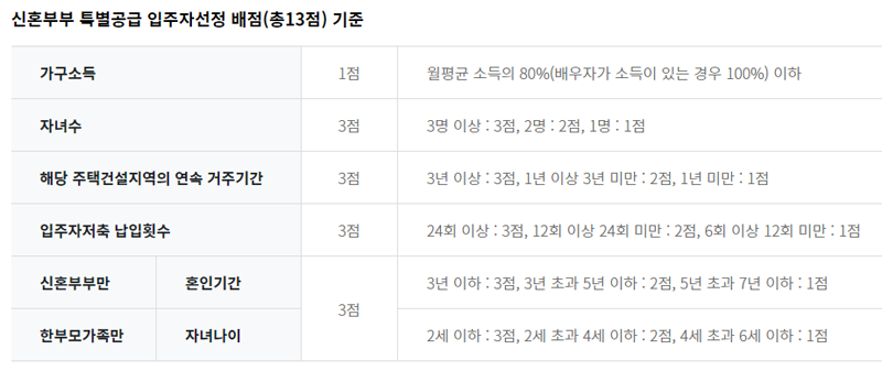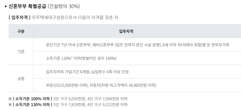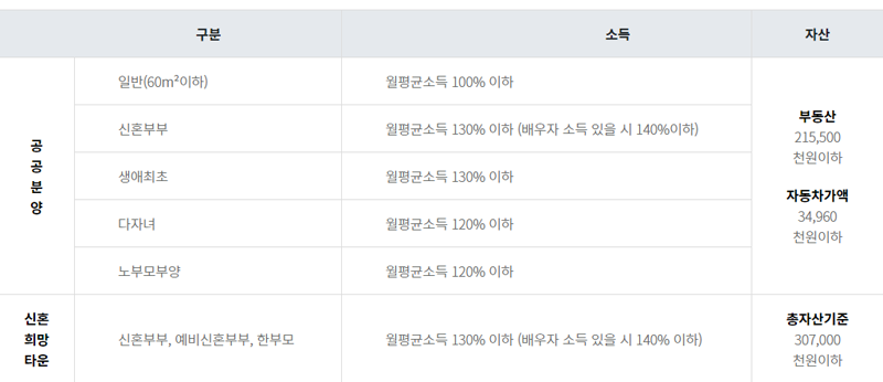 또한 월평균 소득 130%(맞벌이 140%) 기준을 충족해야 하며 자산 기준 3억 700만 원 이하여야 청약 신청이 가능하다.