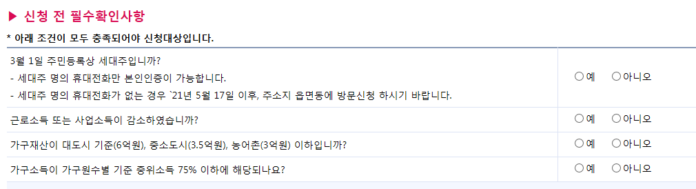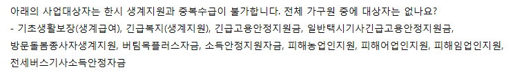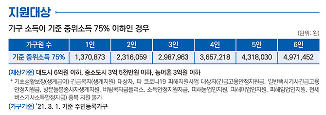 ※ 단, 생계급여와 같은 다른 복지제도의 지원을 받지 못했거나, 코로나 19 피해 지원 프로그램을 받지 못하는