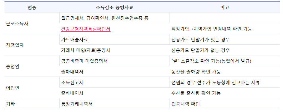 * (증빙자료 예시) 원천징수영수증, 소득금액증명원, 소득감소확인서, 매출입전표, 거래업체간의 거래내역, 통장거래 내역사본(입금내역) 등, (본인작성) 소득(매출)감소신고서