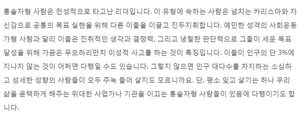 검사 결과는 상당히 디테일하게 나온다. (ex. 대담한 통솔자)