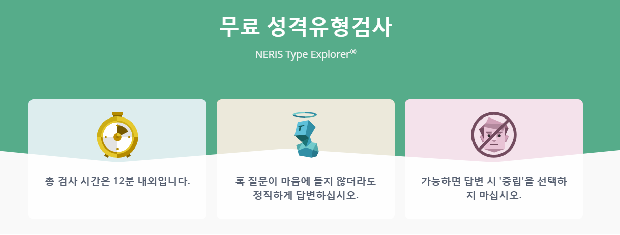 mbti 검사 전 주의해야 할 점은 총 검사시간은 12분 내외이며 질문이 다소 마음에 들지 않더라도 정직하게 대답해야 한다. 그리고 가능하면 답변 시 '중립'을 선택하지 말아야 하는 것 등이다. 검사시간을 정해두는 이유는 질문에 대해 지나치게 고민할 경우 자신에게 맞는 유형이 달라질 수도 있기 때문이다.