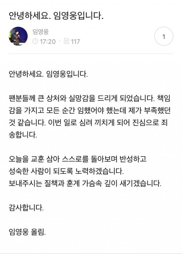 실내 흡연 및 마스크 미착용으로 물의를 일으킨 임영웅이 논란이 일어난 지 하루 지난 시점에서 직접 사과했다. 임영웅은 지난 5일 공식 팬카페를 통해 사과문을 게시했다. 그는 "팬분들에게 큰 상처와 실망감을 드리게 되었습니다. 책임감을 갖고 모든 순간 임했어야 하는데 부족했던 것 같습니다. 이번 일로 심려 끼치게 돼 진심으로 죄송합니다. 오늘을 교훈 삼아 스스로를 돌아보며 반성하고 성숙한 사람이 되도록 노력하겠습니다. 보내주시는 질책과 훈계 가슴속 깊이 새기겠습니다"라고 전했다.