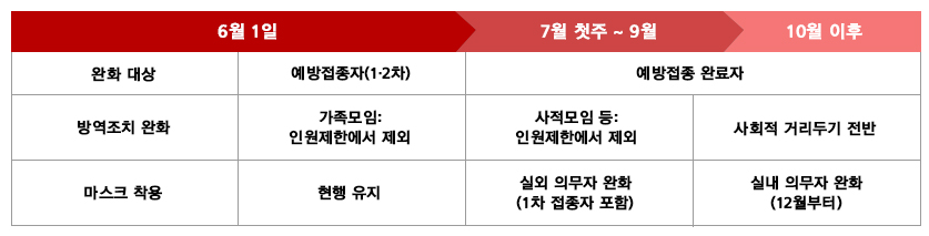 전국민 70% 이상이 1차 접종을 완료하는 9월 말 이후에는 현재의 5단계 사회적 거리두기 대신 전면 재조정된 방역 기준을 도입할 예정이며 집단 면역이 달서 오디는 시점에는 실내에서의 마스크 착용 완화도 검토될 예정이라 한다.